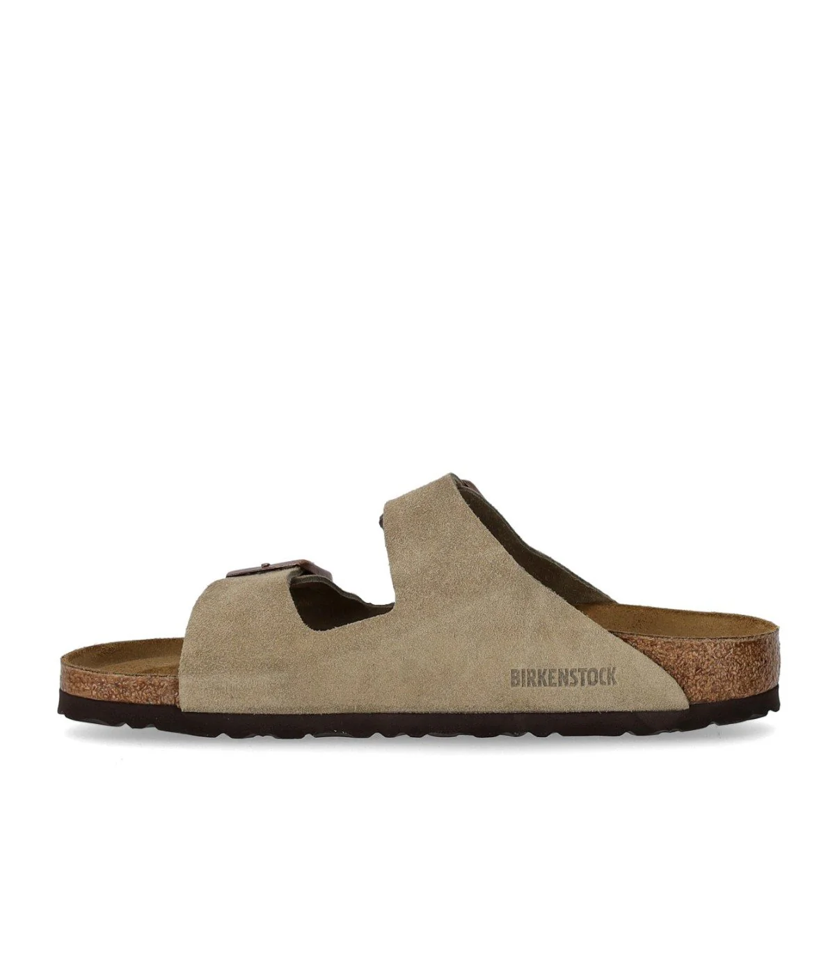 Arizona slide by Birkenstock in taupe colored suede leather. Cork sole and rubber sole, 3 cm high. Narrow fit.