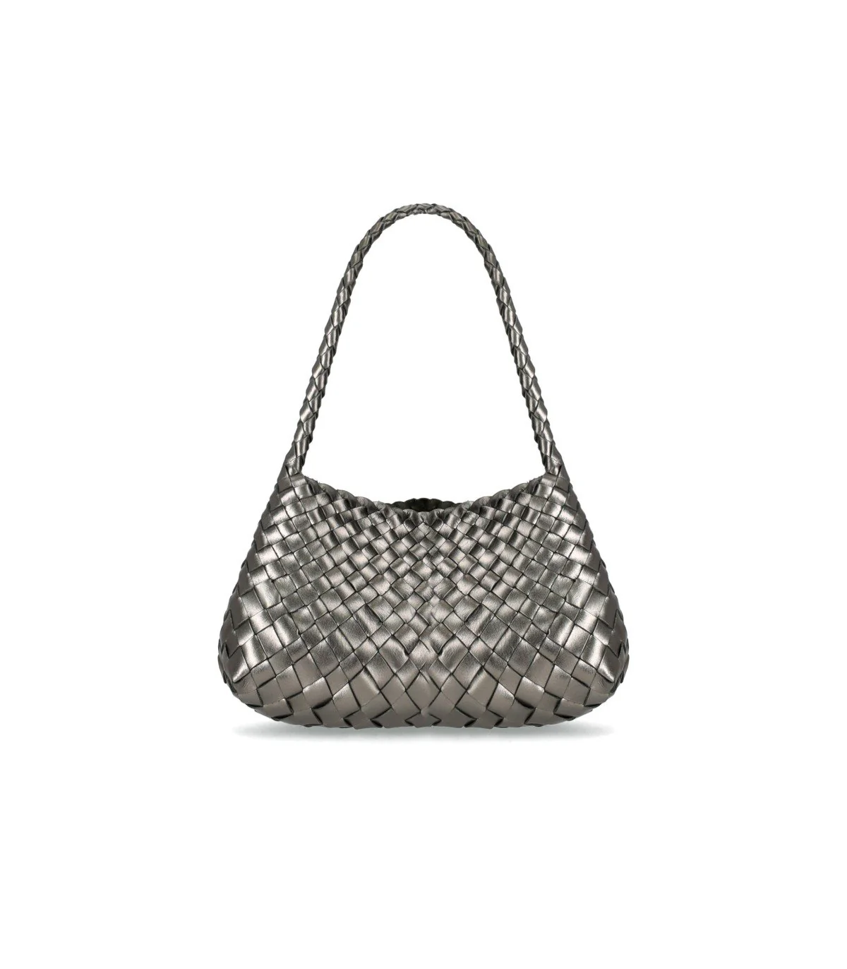 Rosanna bag by Dragon Diffusion made of silver metallic leather, woven, featuring a thin handle and unlined interior. Dimensions: 31x17x10 cm.