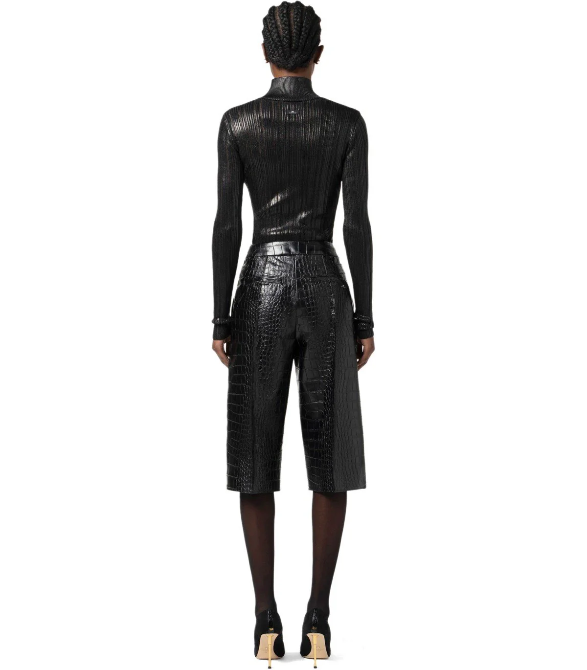 Top by Elisabetta Franchi made from black technical fabric with a metallic finish and semi-sheer ribbed texture. High neckline. Slim fit.