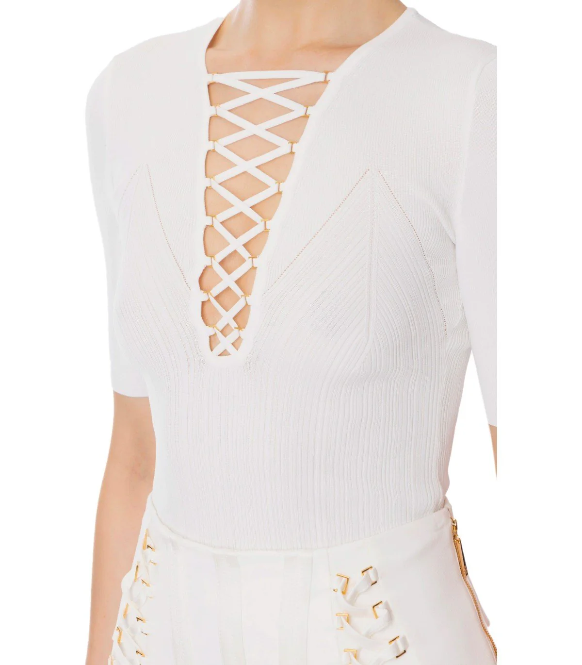 Top by Elisabetta Franchi made of viscose blend with a corn point texture, in ivory white. Characterized by crisscross laces on the bust in a corset style embellished with golden metal rings, it features a V-neckline. Equipped with elbow-length sleeves, it is finished with ribbed detailing. Adorned with a logo label in fabric applied on the back of the garment. Fitted silhouette.