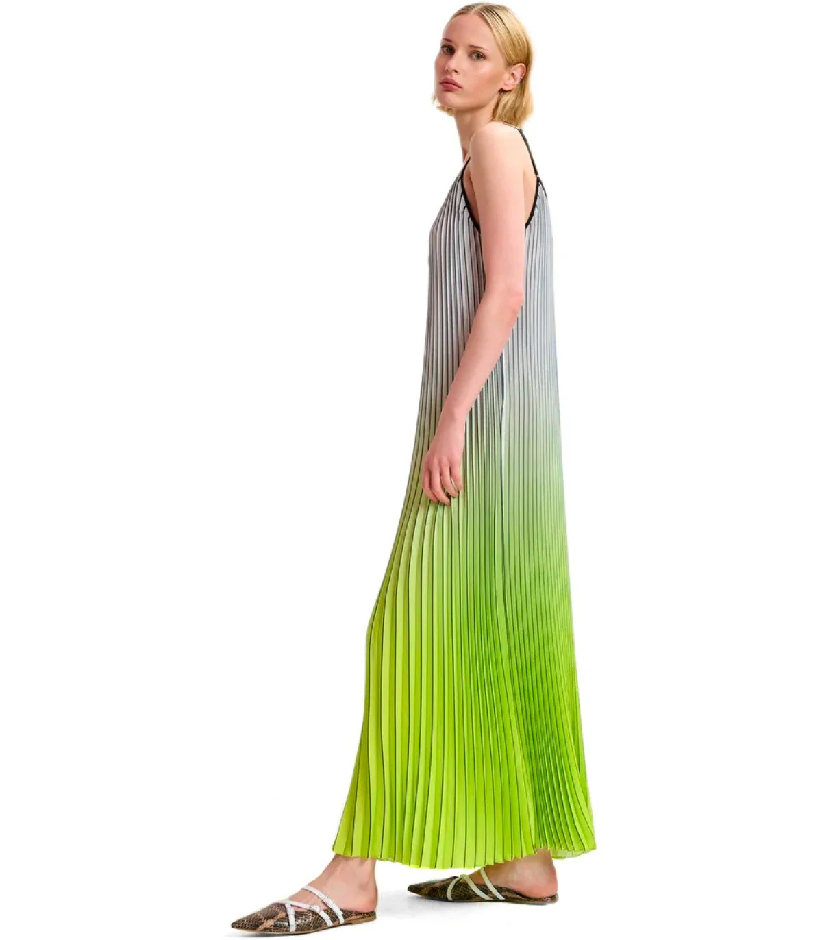 Long Haurus dress by Essentiel Antwerp made of lightweight fabric in shades of green, black, and gray with a gradient effect. Adorned with an all-over pleated design, it features a trapeze silhouette, V-neckline, and adjustable thin straps. Relaxed fit.
