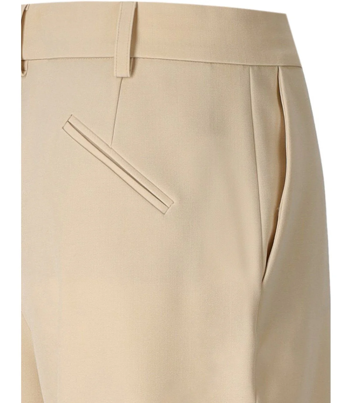 Bermuda by Federica Tosi made of a polyester and virgin wool blend in nude pink. Characterized by a high waist with belt loops, it features side angled pockets. Central closure with zip and hidden hooks. Wide leg with a pressed crease, knee-length. Loose fit.