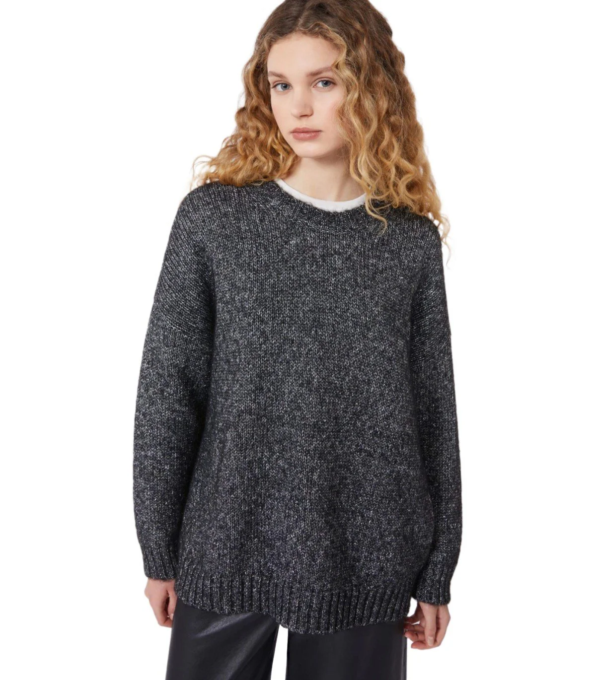 Max Mara Weekend Furetto sweater made from mohair and lurex yarn in anthracite gray tones. Raglan sleeves, ribbed trims at the neck, cuffs, and hem. Oversized fit.