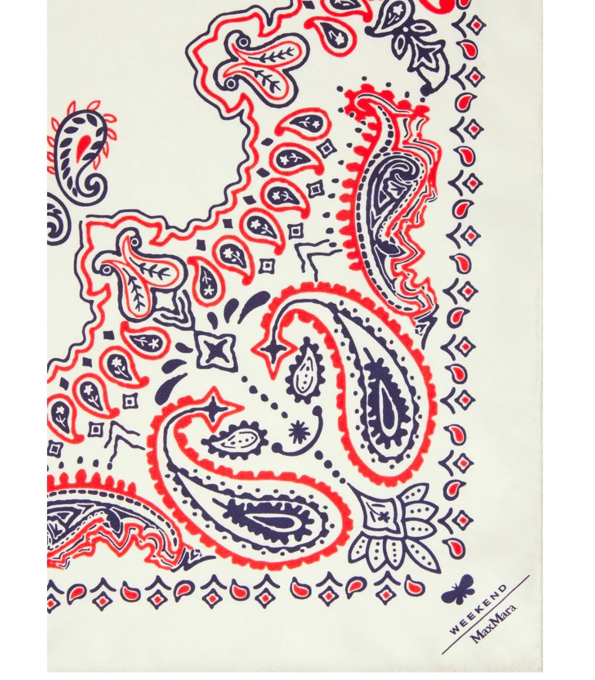 Siam scarf by Max Mara Weekend made of pure white silk with a bandana print in shades of red and midnight blue. Dimensions: 65x65 cm.